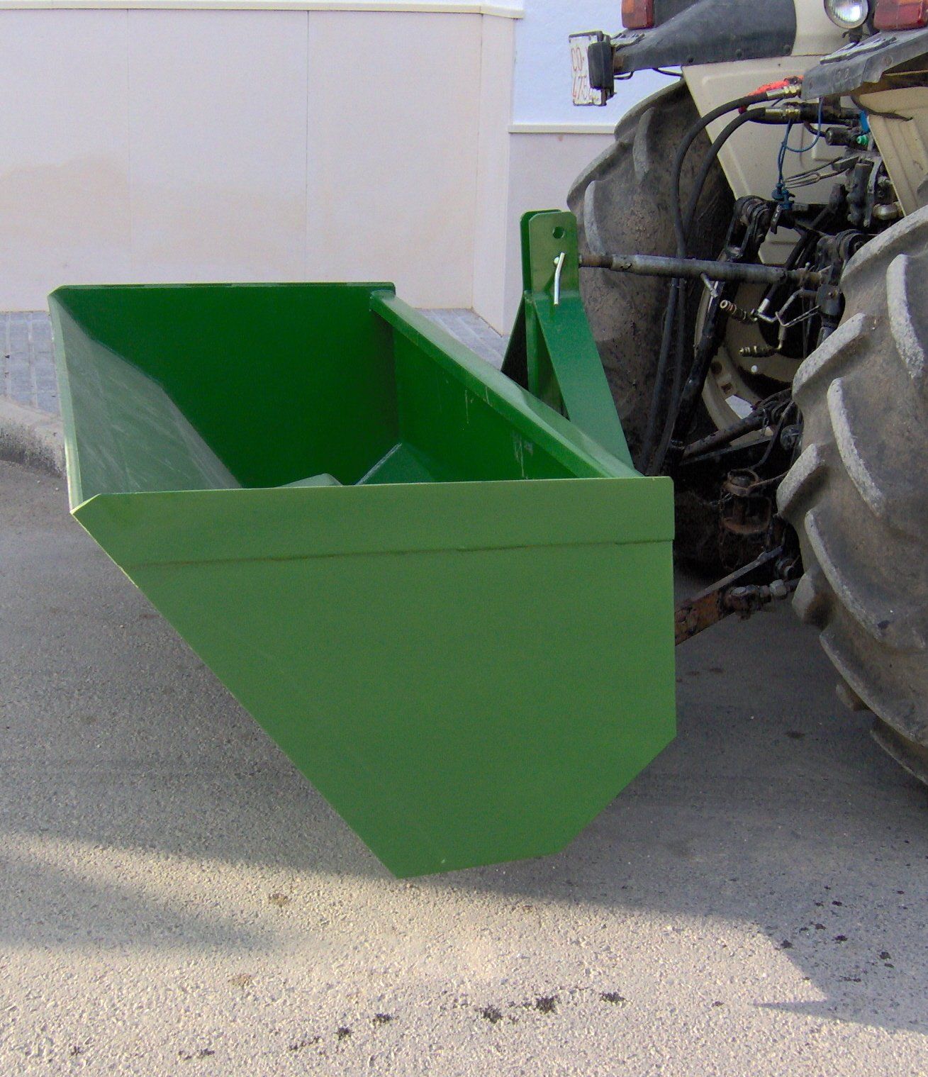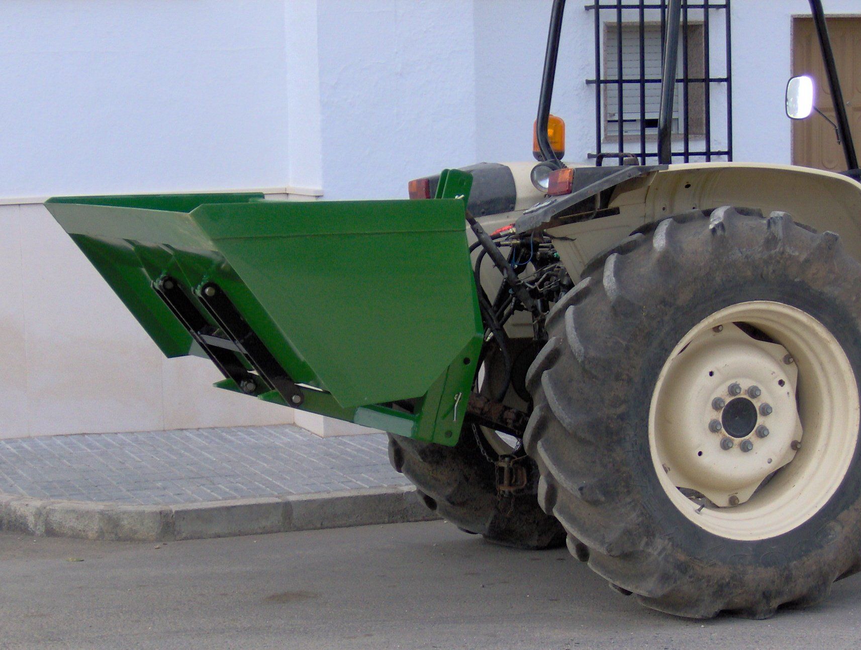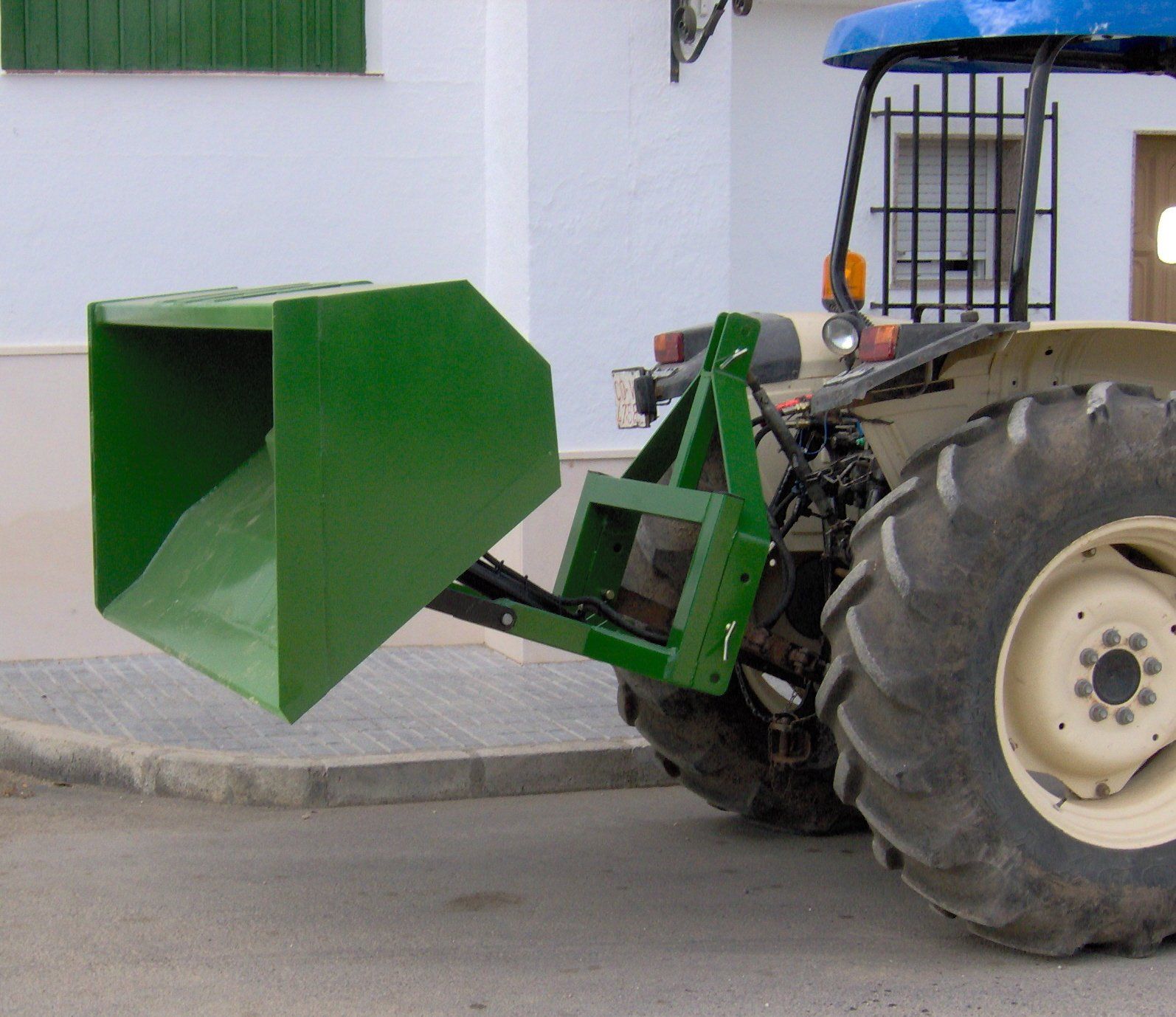 Cazo hidráulico adaptable al enganche tripuntal del tractor. Gran utilidad para la carga de cualquier materia o para la limpieza de suelos, logra una altura de vaciado de 1 metro.