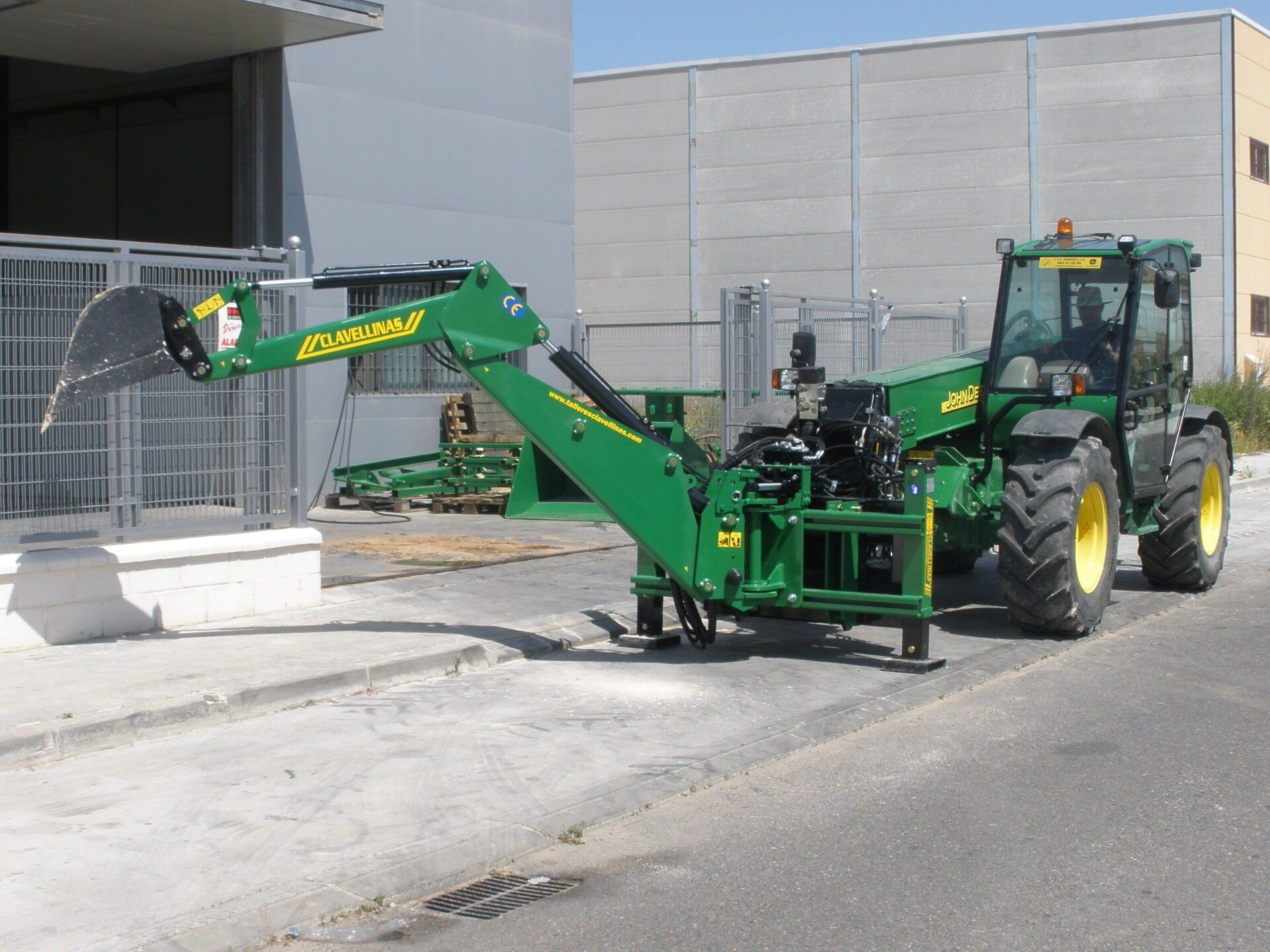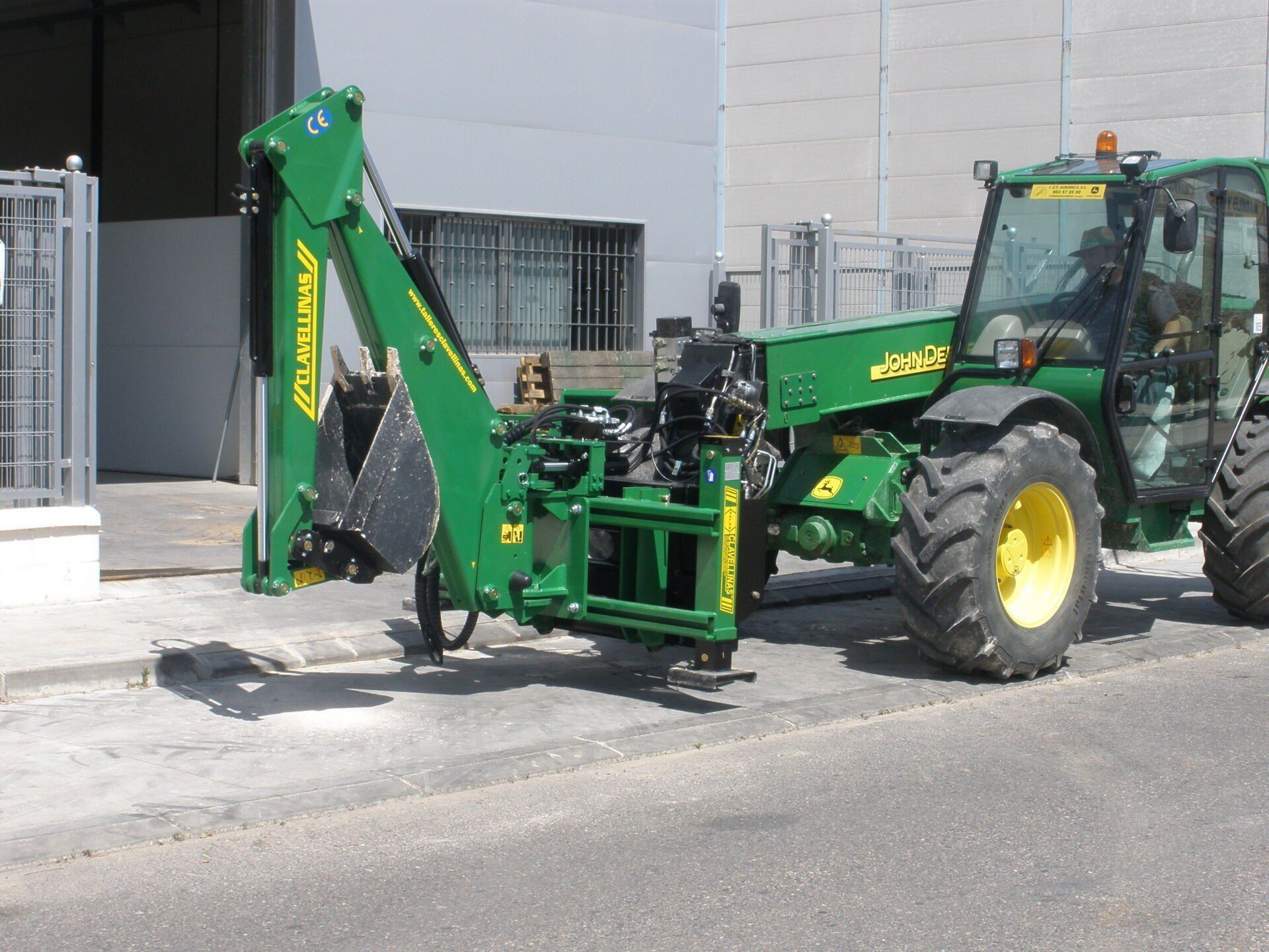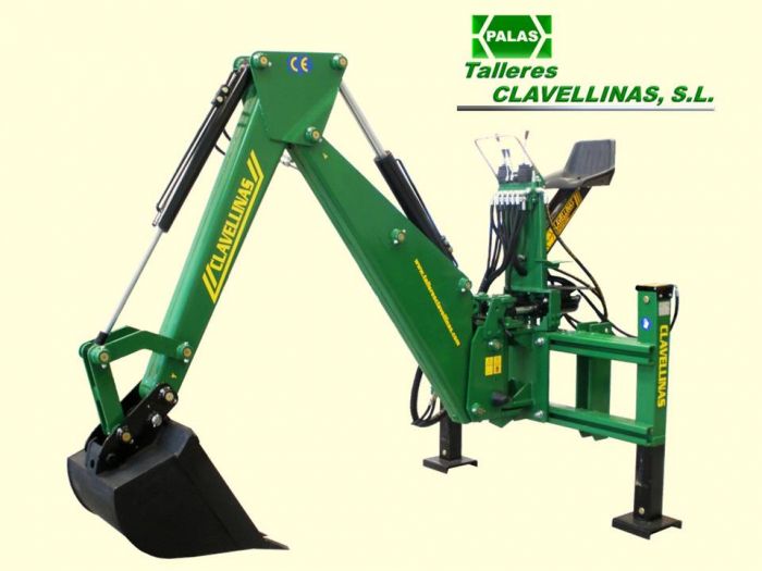 La retro-excavadora "Clavellinas" dispone de enganche rápido tanto al tractor como al cazo, así como la capacidad de desplazarse lateralmente y girar hasta 180º. La profundidad de trabajo de la máquina oscina entre 1,5 y 3,30 metros.